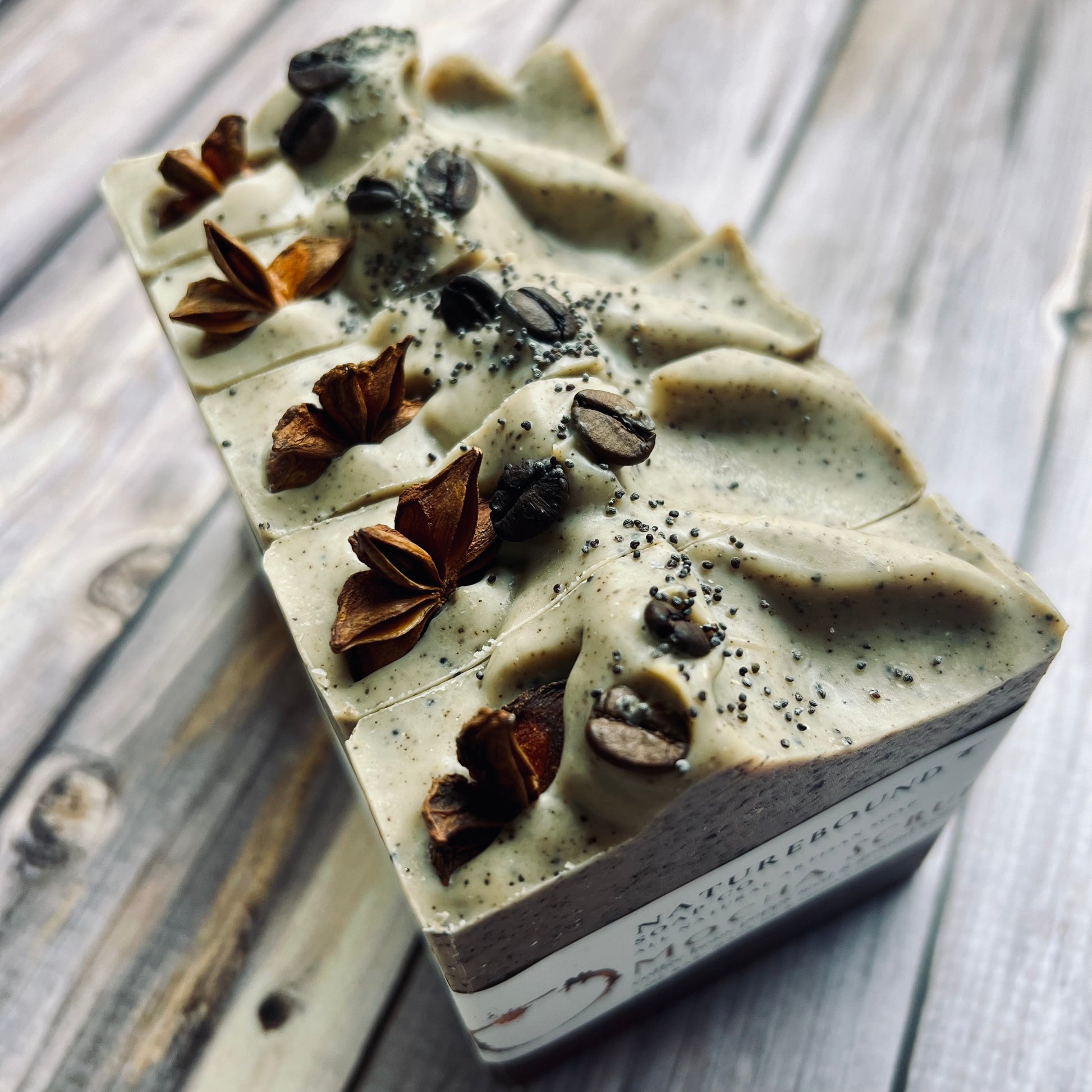 Ingredients: saponified olive, coconut*, rice bran & sunflower* oils, cocoa butter, cacao, coffee, ground loofah, poppy seeds, bentonite clay, essential oils (virginia cedar, black pepper, clove, howood, cassia, litsea cubeba, benzoin resin, star anise.