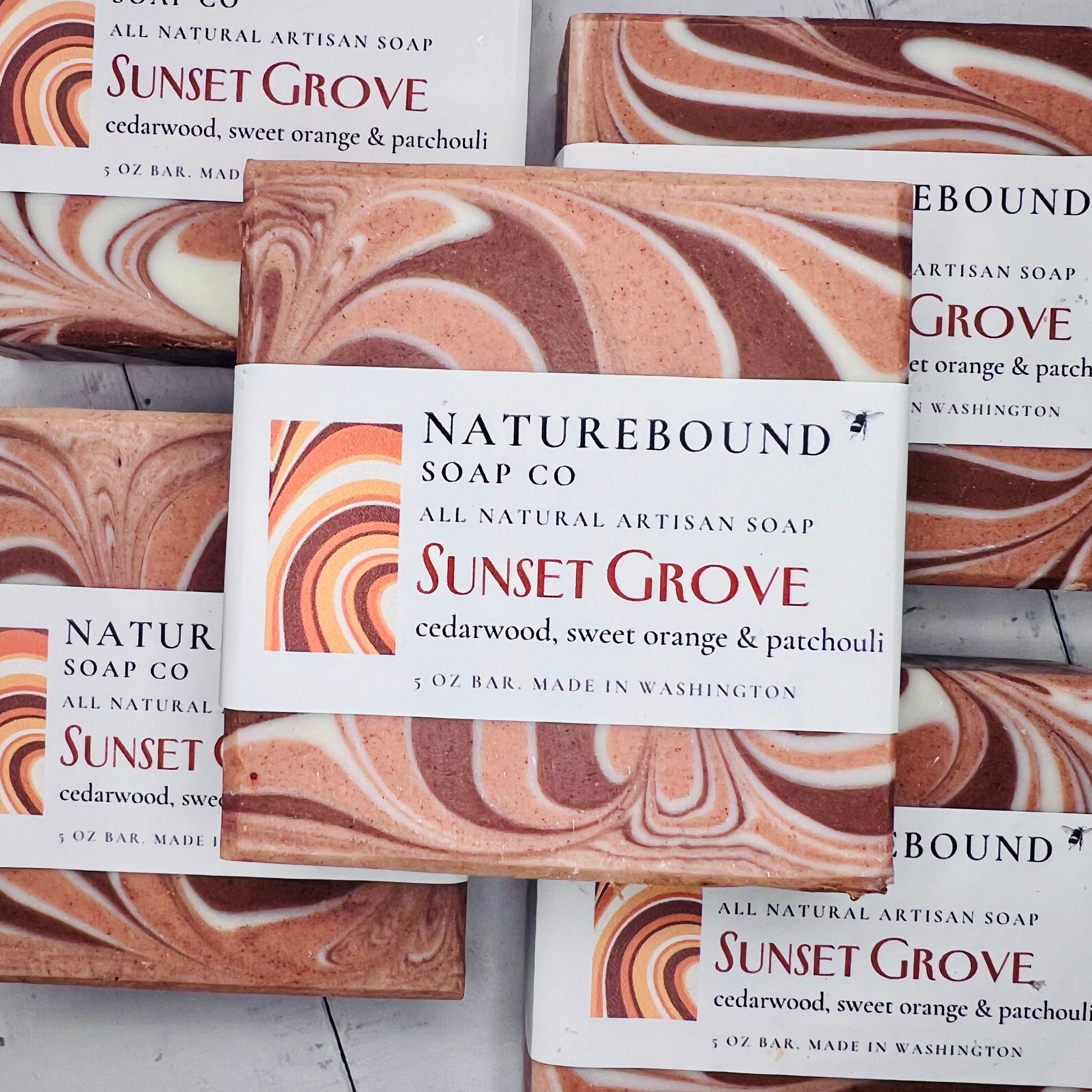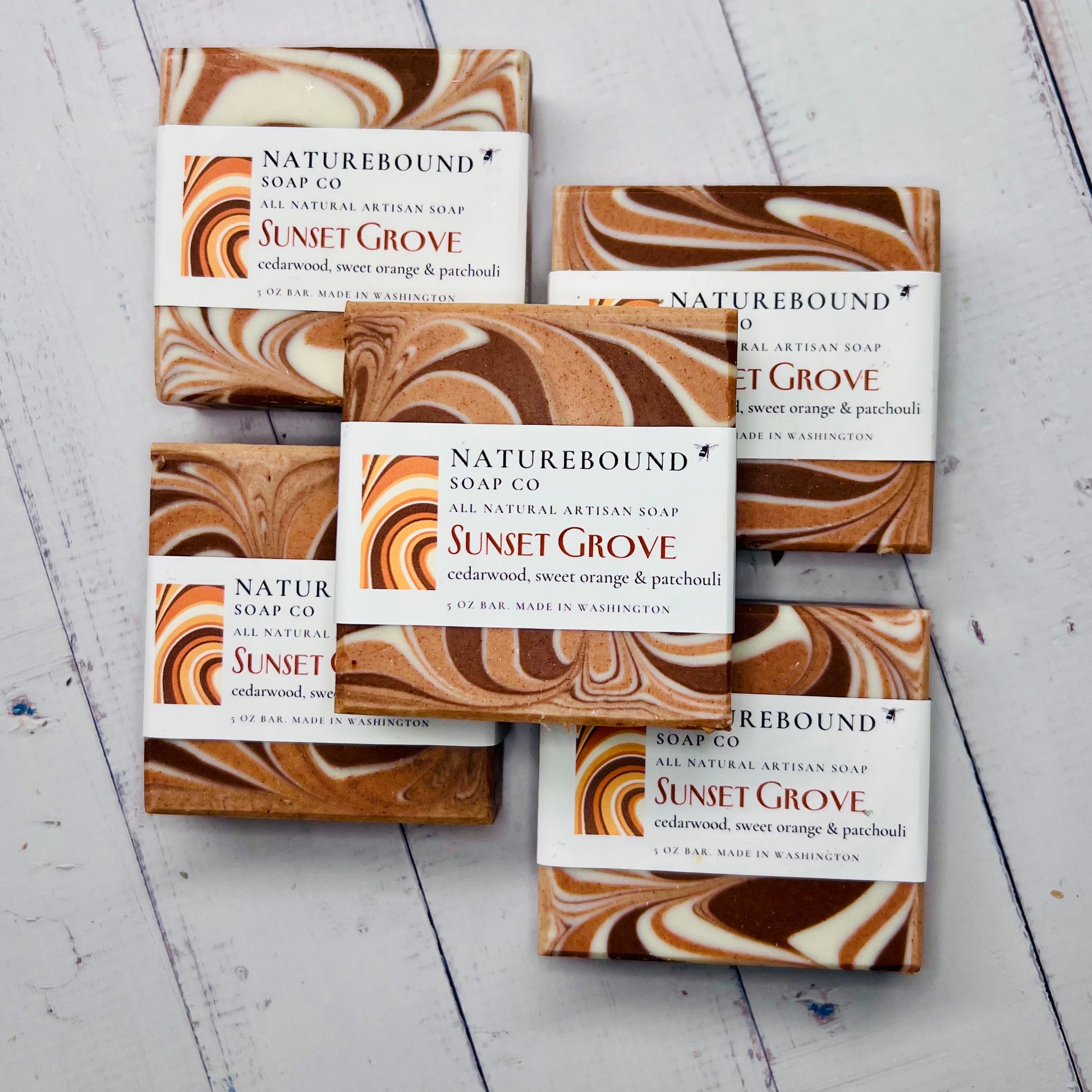 SUNSET GROVE: Swirls of Brazilian clay and raw cacao make a fun and funky soap bar that smells AMAZING! We've blended Atlas Cedar, Sweet Orange and just a touch of Patchouli essential oils, resulting in a fresh and woodsy bathing experience.